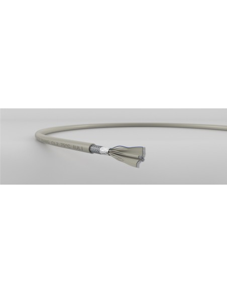 Cavo piatto in guaina tonda, con schermatura. La particolarità di questo articolo é che, sulla base di un flat standard passo 1,27mm, il cavo presenta una periodicità di spirali/nocciatura (35 mm con asola / 25 mm senza asola), che permettono molteplici impieghi, con elevata flessibilità.